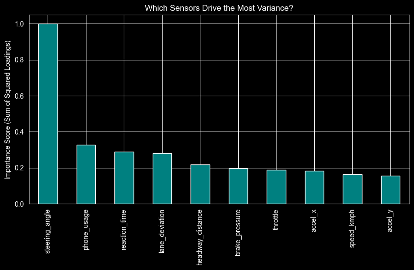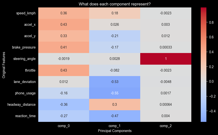 fig.show()with three components we can see a separation between those three. ## PC1 (Aggresive) highs: - throttle - brake_pressure - accel_x lows: - headway_distance ## PC2 (Distracted) highs: - lane_deviation - phone_usage - reaction_time ## PC3 (Chill) lows: - steering_angle