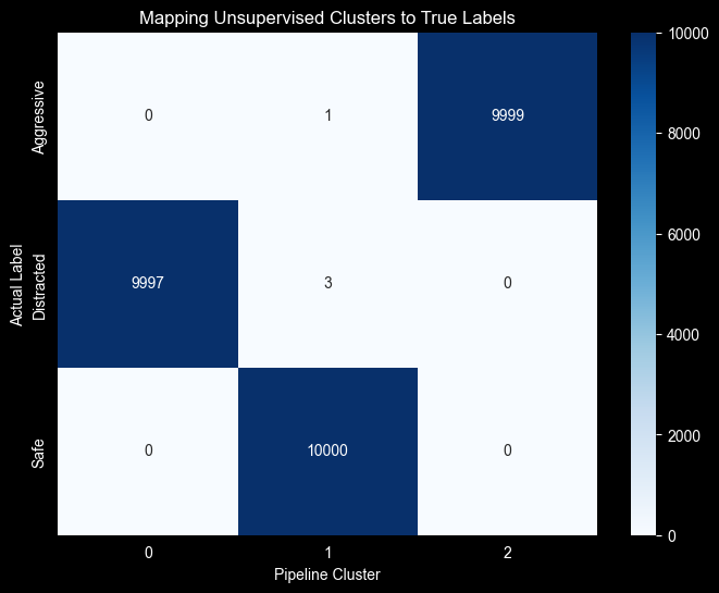 It confirms that the driver behaviors (Safe, Aggressive and Distracted) are linearly separable in the PCA space, and our pipeline can autonomously indentify these profiles.