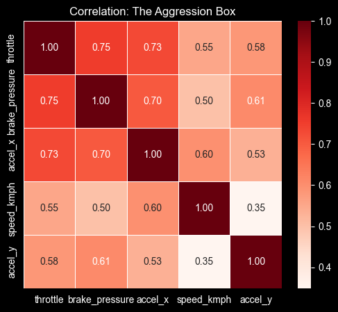 Looking at the correlation of accel_x, brake_pressure and throttle we can infer that the “Agressive drivers” they press the gas and jump straight to smashing the brake pedal without “coasting.” This seems like a classic signature of “tailgating,” or speeding up to something, then panic breaking.