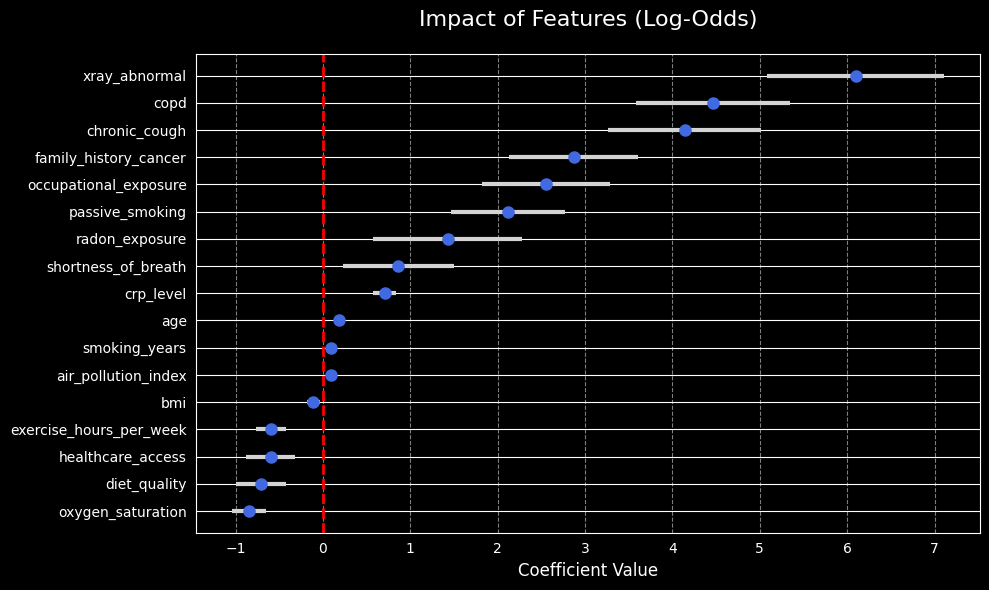 For the patient at index 99, we can see exactly how the model arrived at its positive prediction. Notably, having an abnormal X-ray (xray_abnormal = 1) is a primary driver, increasing the log-odds of the prediction. Other clinical features and medical history also significantly push the risk higher.