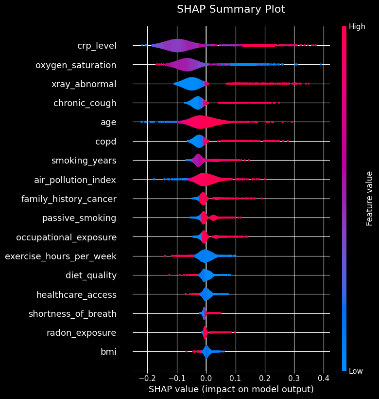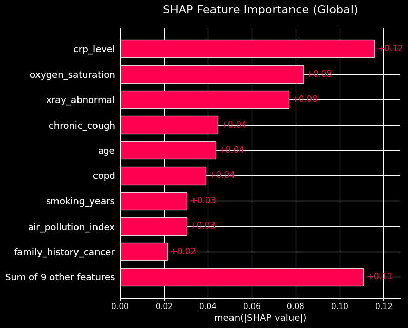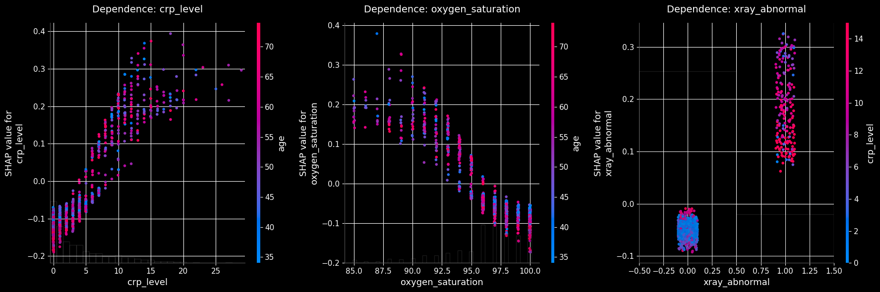 As seen in the plots above, the top three most influential features (crp_level, oxygen_saturation, and xray_abnormal) are all derived from clinical laboratory tests and imaging. This reinforces the clinical validity of the model, as these objective medical measurements strongly drive the predictions.