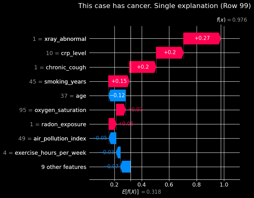 from statsmodels_utils import plot_shap_waterfall_singleindex_to_plot =99predicted_probability = final_model_logit.predict(with_constant.iloc[[index_to_plot]])label =f"This case {"has"if predicted_probability.iloc[0] >0.5else"dont have"} cancer."single_explanation_image =f'{plot_folder}/single_explanation.jpg'plot_shap_waterfall_single( final_model_logit, with_constant, row_index=index_to_plot, title=f"{label} Single explanation", plot_file=single_explanation_image)