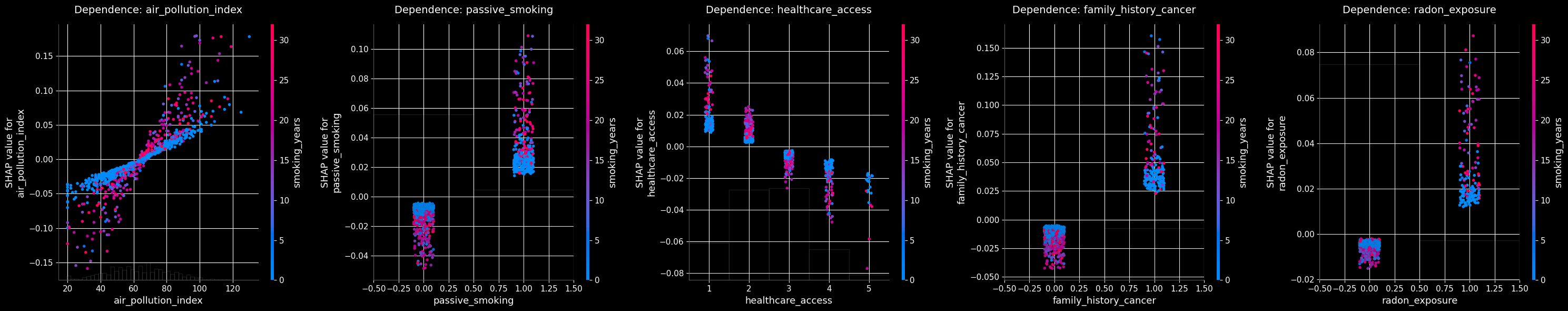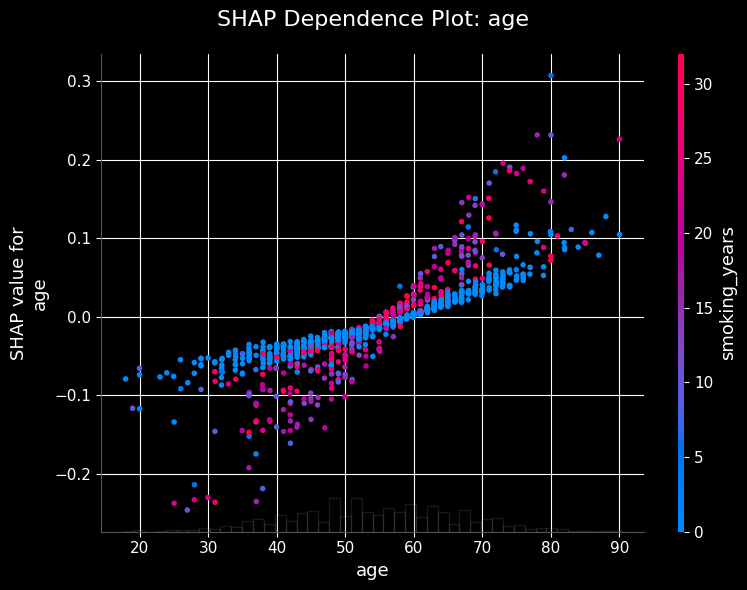 SHAP dependence plots show the marginal effect of a feature on the prediction. Let’s visualize how the model’s output depends on specific variables like age.