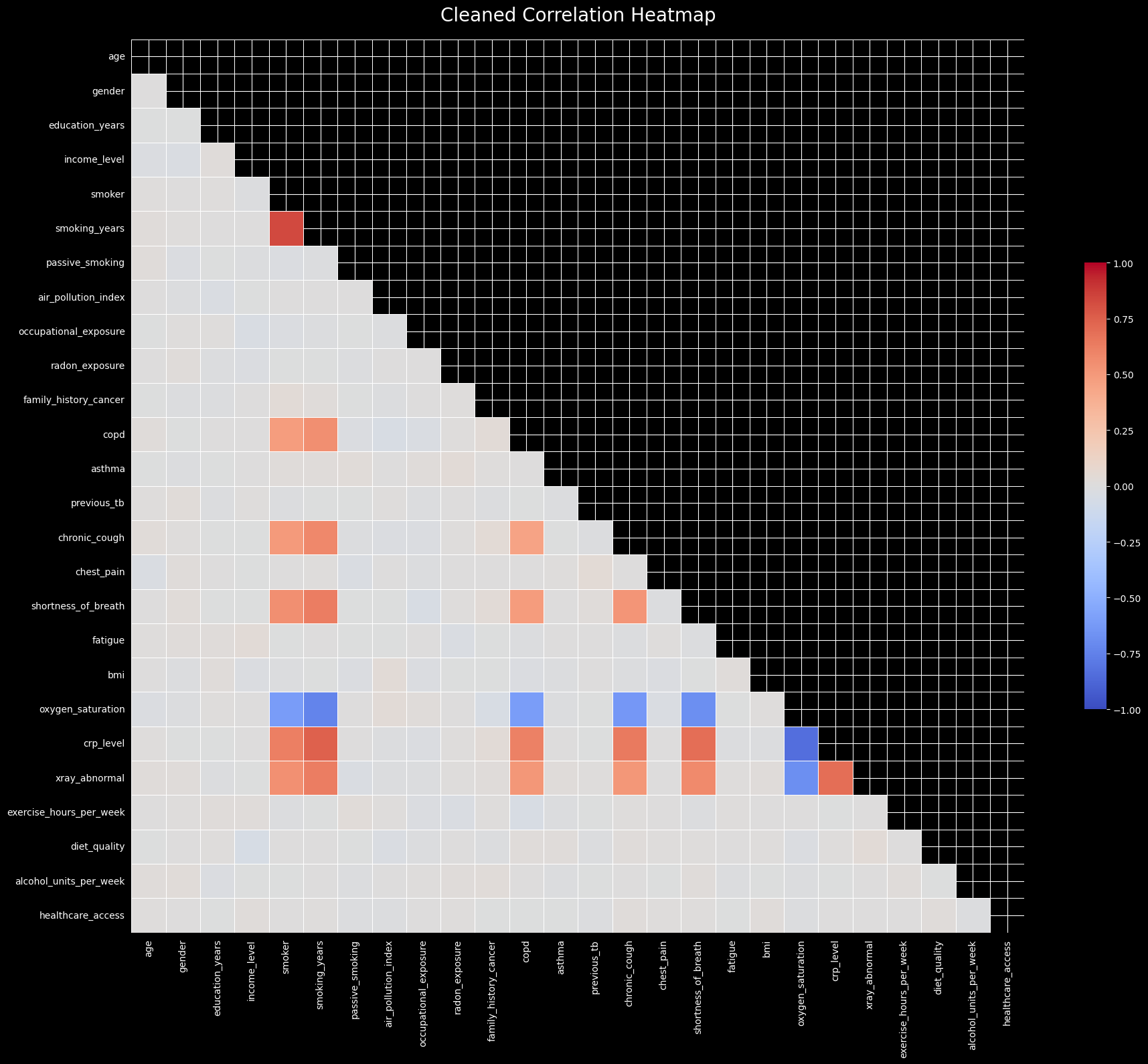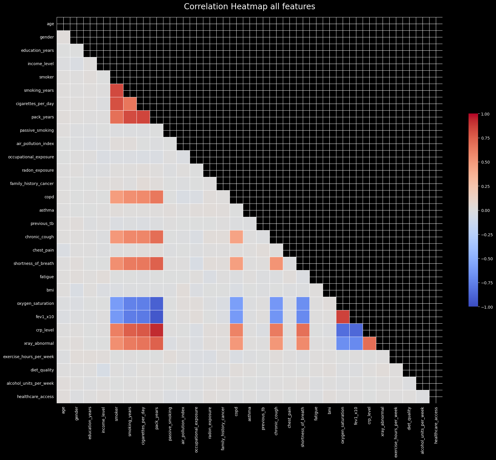 As seen in the correlation heatmap and pair plot, there are strong correlations among certain features (like pack_years and smoking_years). This indicates a potential multicollinearity issue, which we can quantify using the Variance Inflation Factor (VIF). We will recursively calculate VIF and drop features that exceed a threshold to ensure model stability.